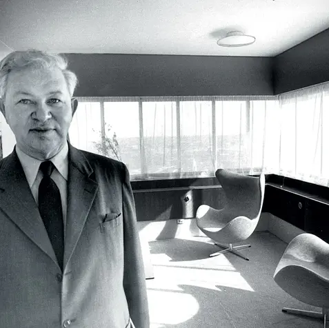 Arne Jacobsen (1902–1971) was a Danish architect and designer celebrated as one of the leading figures of modernism. Trained at the Royal Danish Academy of Fine Arts, he became known for his holistic approach, designing buildings, interiors, and furniture as unified compositions. His architectural work includes the SAS Royal Hotel in Copenhagen, where he created everything from the structure to the cutlery. As a furniture designer, he produced several 20th-century icons, including the Ant Chair (1952), the Series 7 Chair (1955), and the Egg and Swan chairs (1958). Jacobsen’s style combined functionalism with graceful organic forms, establishing a timeless aesthetic that continues to influence contemporary design worldwide.