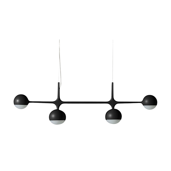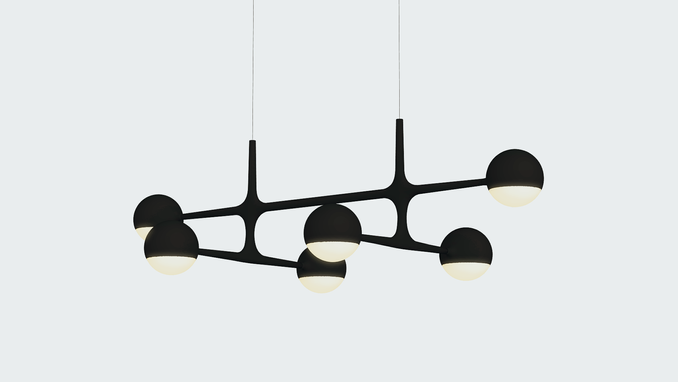 Dot Pattern Light, 6-sphere suspension designed by Charles and Ray Eames for Cassina. Produced in 2025, this hanging lighting fixture reimagines the iconic Eames Dot Pattern—a perforated graphic motif from their mid-century textile and furniture explorations—into a modern, sculptural chandelier form. The design features six luminous spheres clustered in a single compact block, crafted from matte aluminum in black or white finishes, blending minimalist geometry with diffused, ambient glow for contemporary interiors.