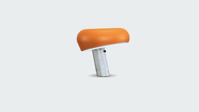 The Snoopy table lamp, designed in 1967 by Achille Castiglioni and Pier Giacomo Castiglioni for Flos, is one of the most recognizable icons of Italian lighting design. The lamp features a thick, beveled base carved from white Carrara marble, supporting a glossy enamel metal reflector whose curved silhouette subtly recalls the profile of the famous cartoon dog from which it takes its name. Combining industrial precision with playful character, the design balances weight and lightness: the heavy marble base anchors the object while the smooth metal shade seems to hover above it. Equipped with an integrated glass diffuser and a discreet dimmer switch, the Snoopy lamp reflects the Castiglioni brothers’ approach to design, where technical ingenuity meets humor and refined material contrasts.