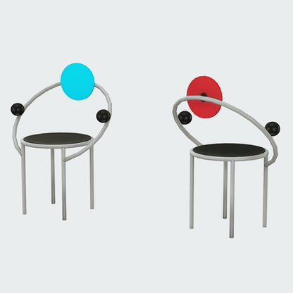 First is an iconic and sculptural creation conceived by De Lucchi. The designer seems to be paying homage to Alexander Calder in the lightness and mobility of the forms, its true distinctive features. Produced in a small series, it reinterprets the perfect combination of industry and crafts, in true Memphis style. It stands out for the blue adjustable back and the two black spheres that act as armrests.