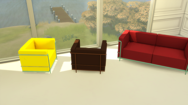The LC3 Fauteuil Grand Confort, grand modèle family includes a two-seat sofa, three-seat sofa and armchair with armrests, steel structure with polished chrome finish or painted in the hues of the color palette of the collection.