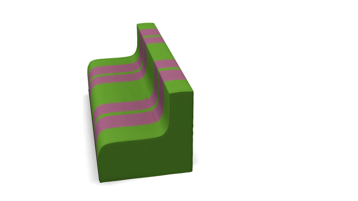 Sofo is a seat to place in a row, like a train, or to stack to build solid, colorful mountains. It is simply a block made with an S—shaped cut from a cube of polyurethane, covered with fabric featuring two large stripes. The result of a very simple operation, without wasted material or thought. It presents itself as a compact, abstract, colorful object that communicates the joy of living, like things that arrive from another world.