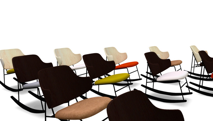 The Penguin Rocking Chair leans towards the American modernists from the 1950s and 1960s. So beautiful that it can be displayed as a work of art in any home, it is open in its construction with a curved back of oak or walnut veneer and has a seat upholstered in fabric or leather against the stringent steel frame. Contrasting and playful, while being well-proportioned and fully formed, the chair, designed by furniture designer Ib Kofod-Larsen in 1953, is a piece of Danish cultural heritage and design history – and maybe more modern than ever before with its beautiful silhouette and sculptural, organic lines and curves.